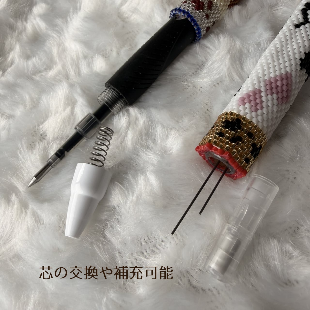 いつものシャープペンとボールペンがビーズが織りなすキラメキが日常の筆記やメモ取りを楽しくしてくれるセットです。