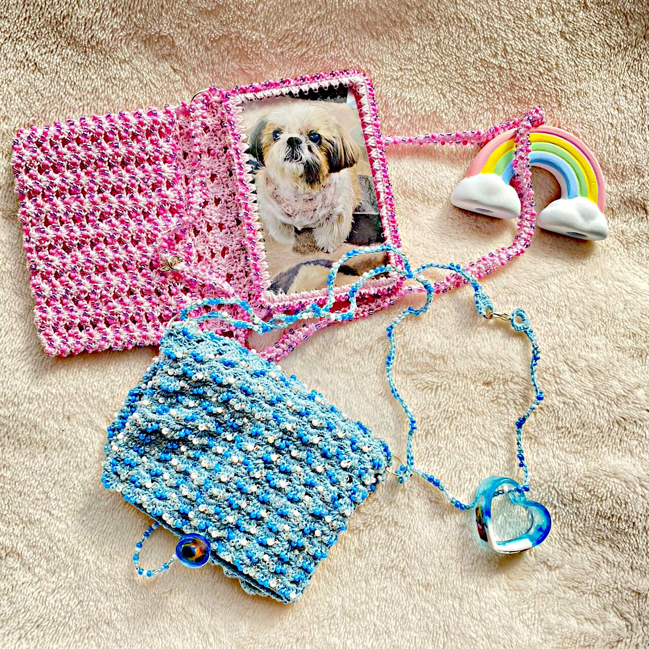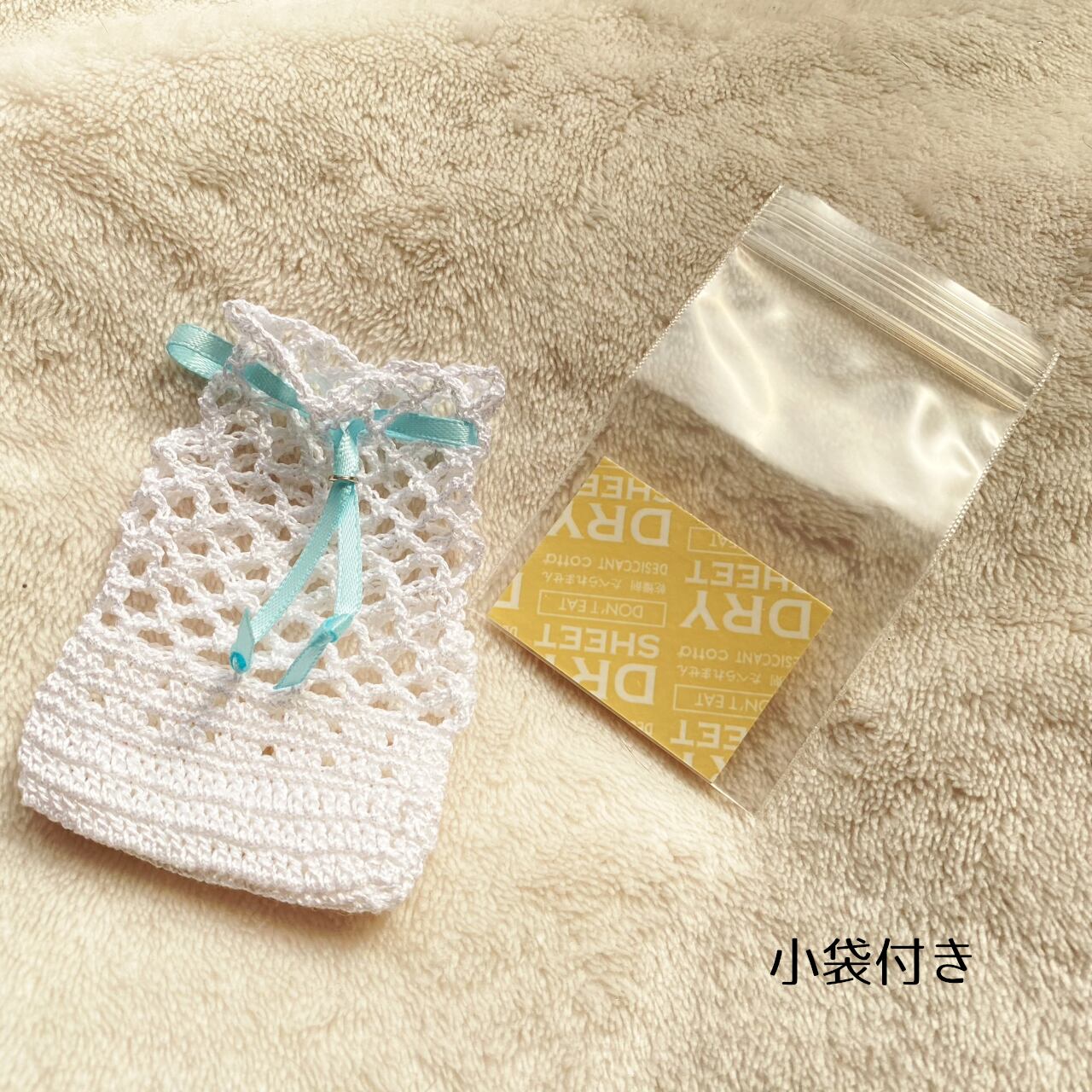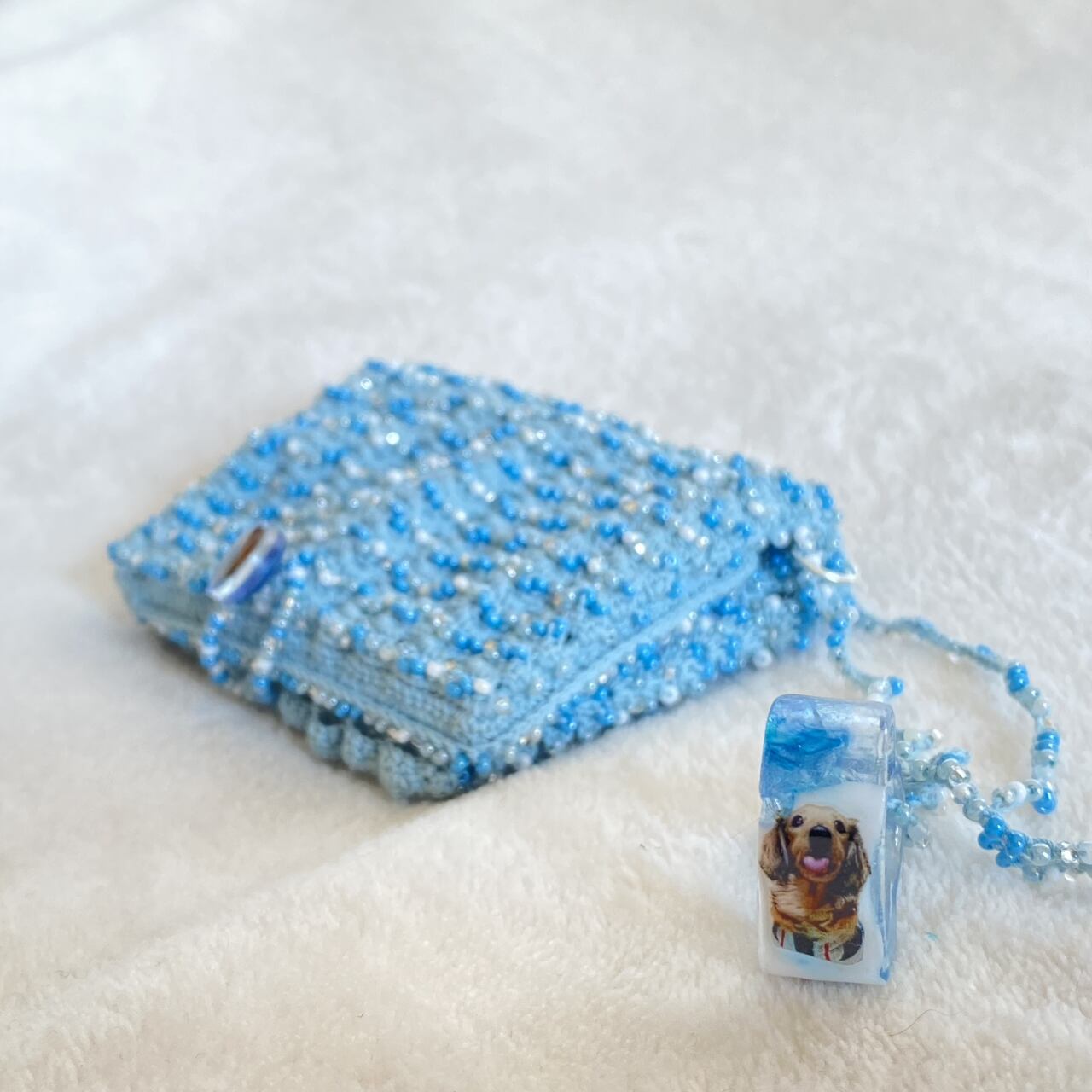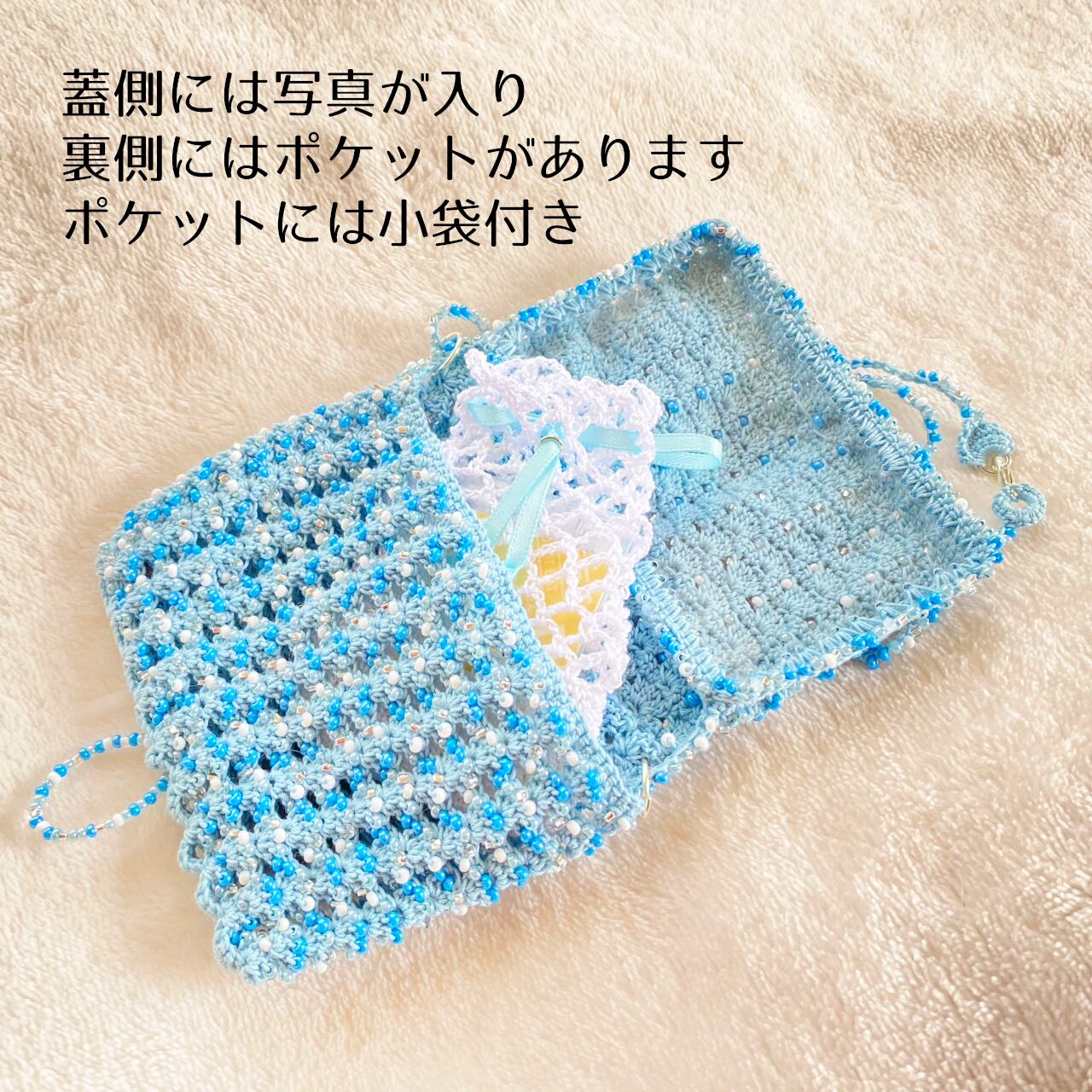 片方には写真を、片方には遺骨や遺毛を入れられるようにと、左右がポケットになっています。遺骨や遺毛入れるためのジップ袋に乾燥剤を入れ、そのジップ袋を入れるための小袋もお付けします。