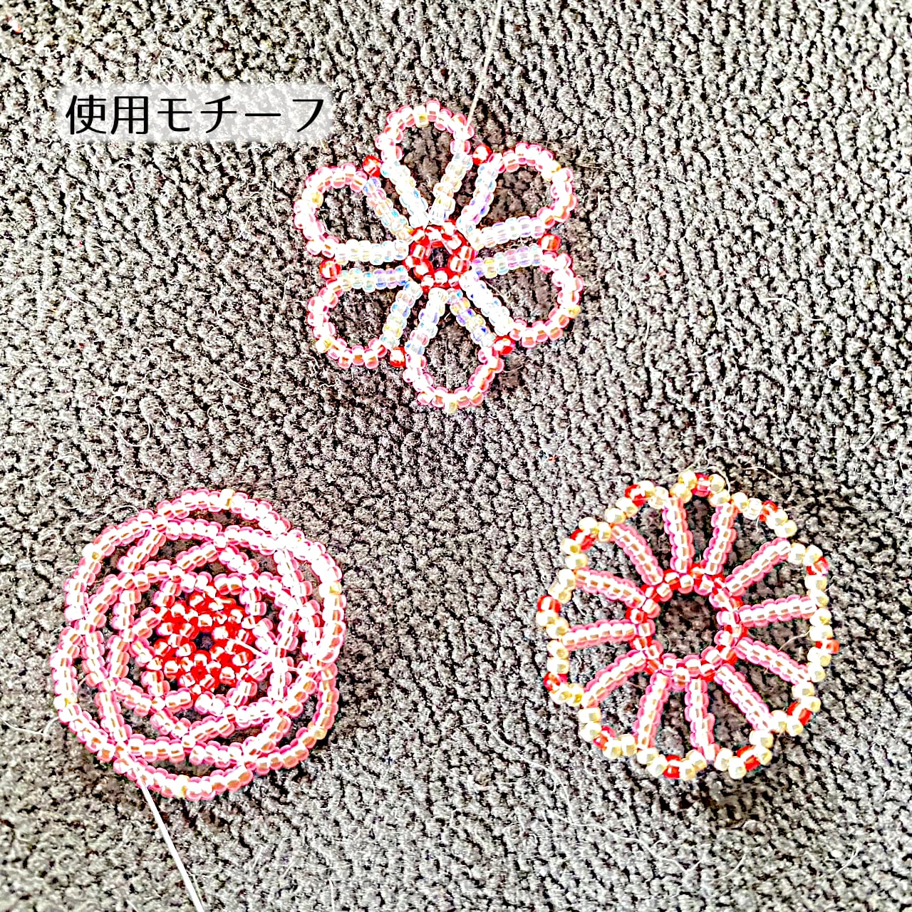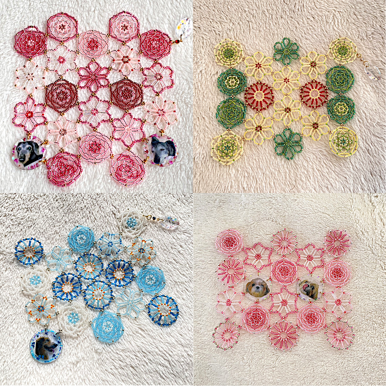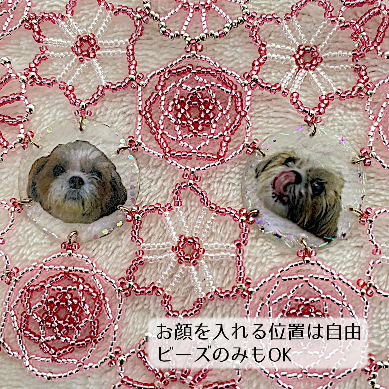 2か所に顔写真を入れ、3種のモチーフをつないだビーズドイリー。顔写真の位置はお好きな場所に配置可能。顔写真なしも承ります。