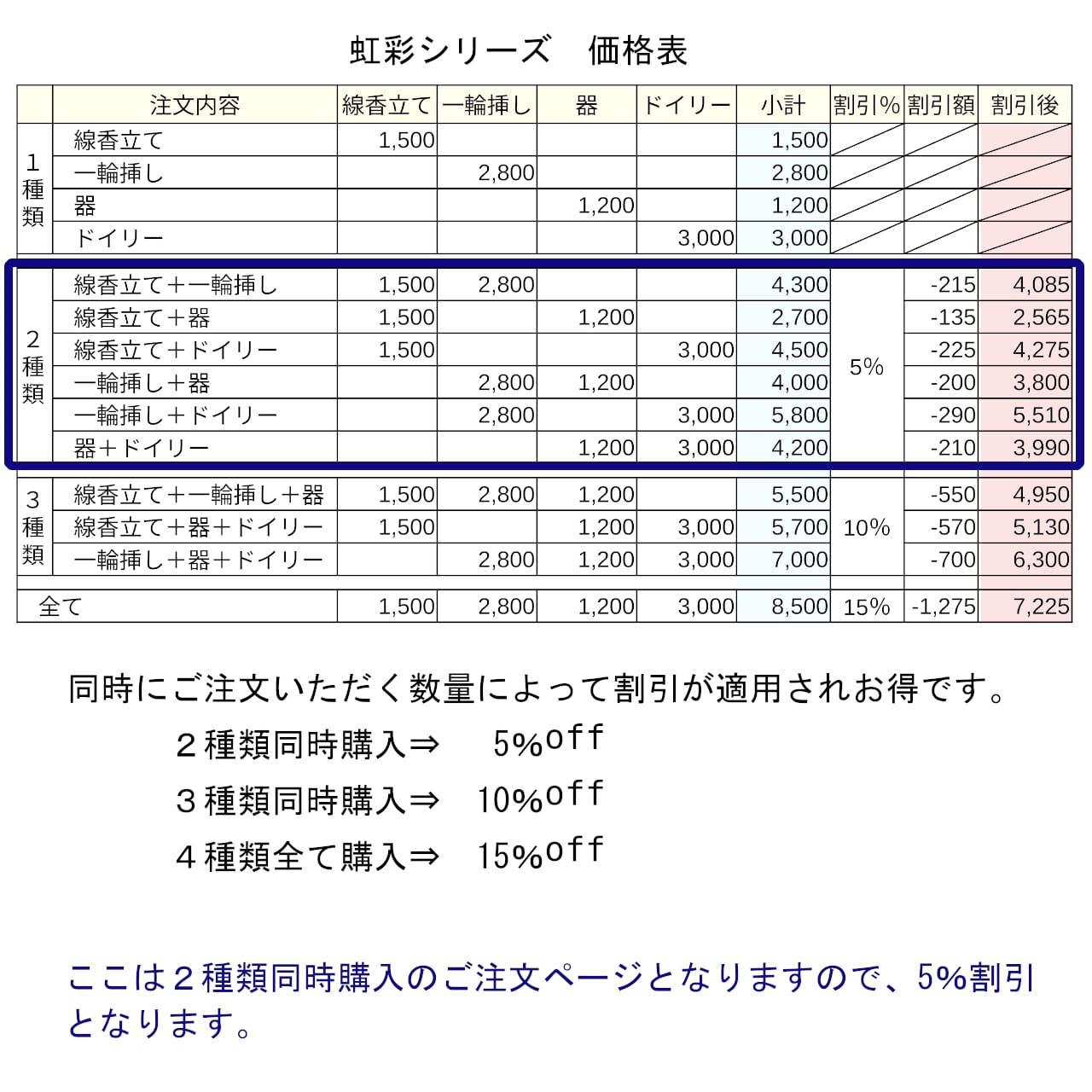 2種類同時購入の場合、[線香立て+小さな器]が5%offで2,565円となりそれに加算という形になります。