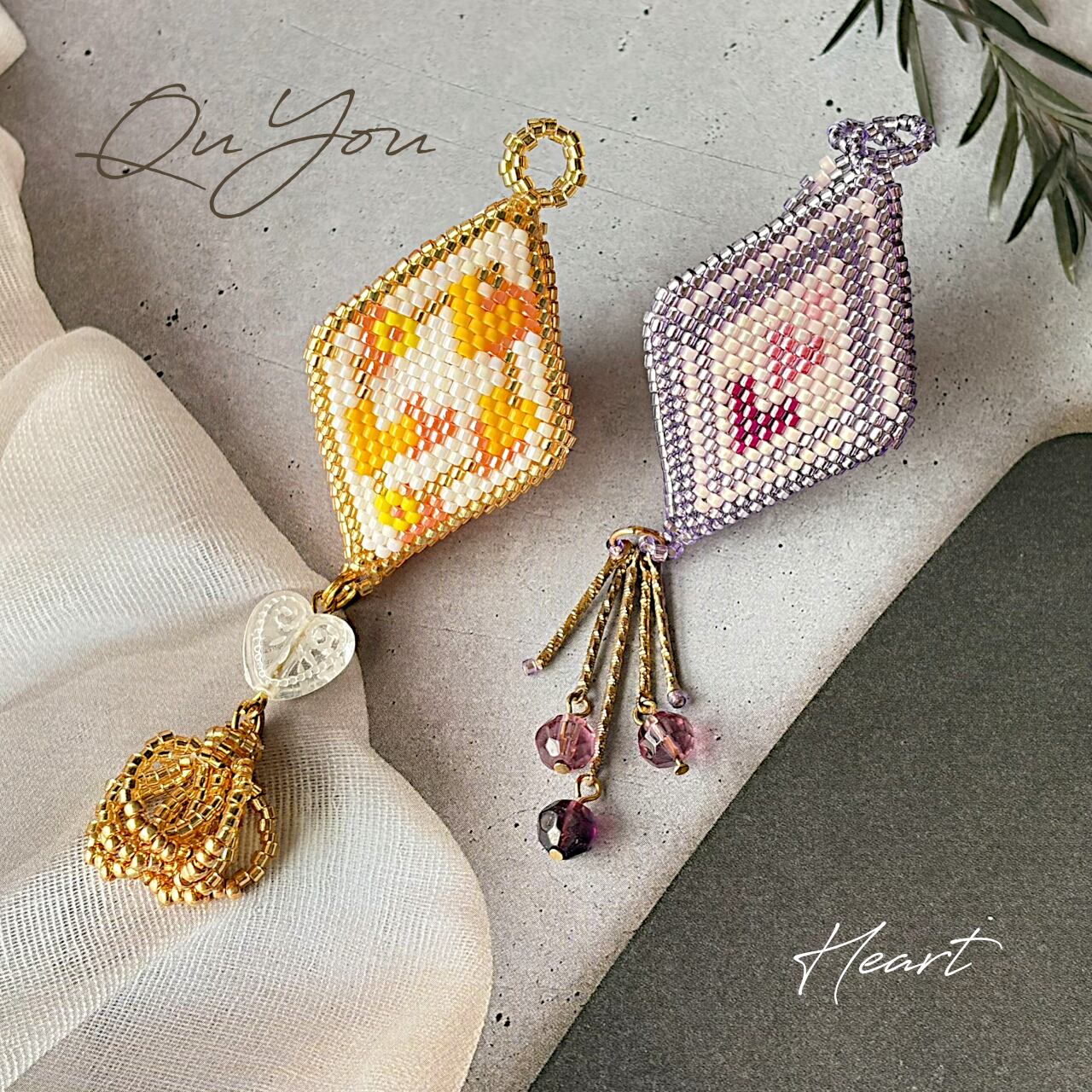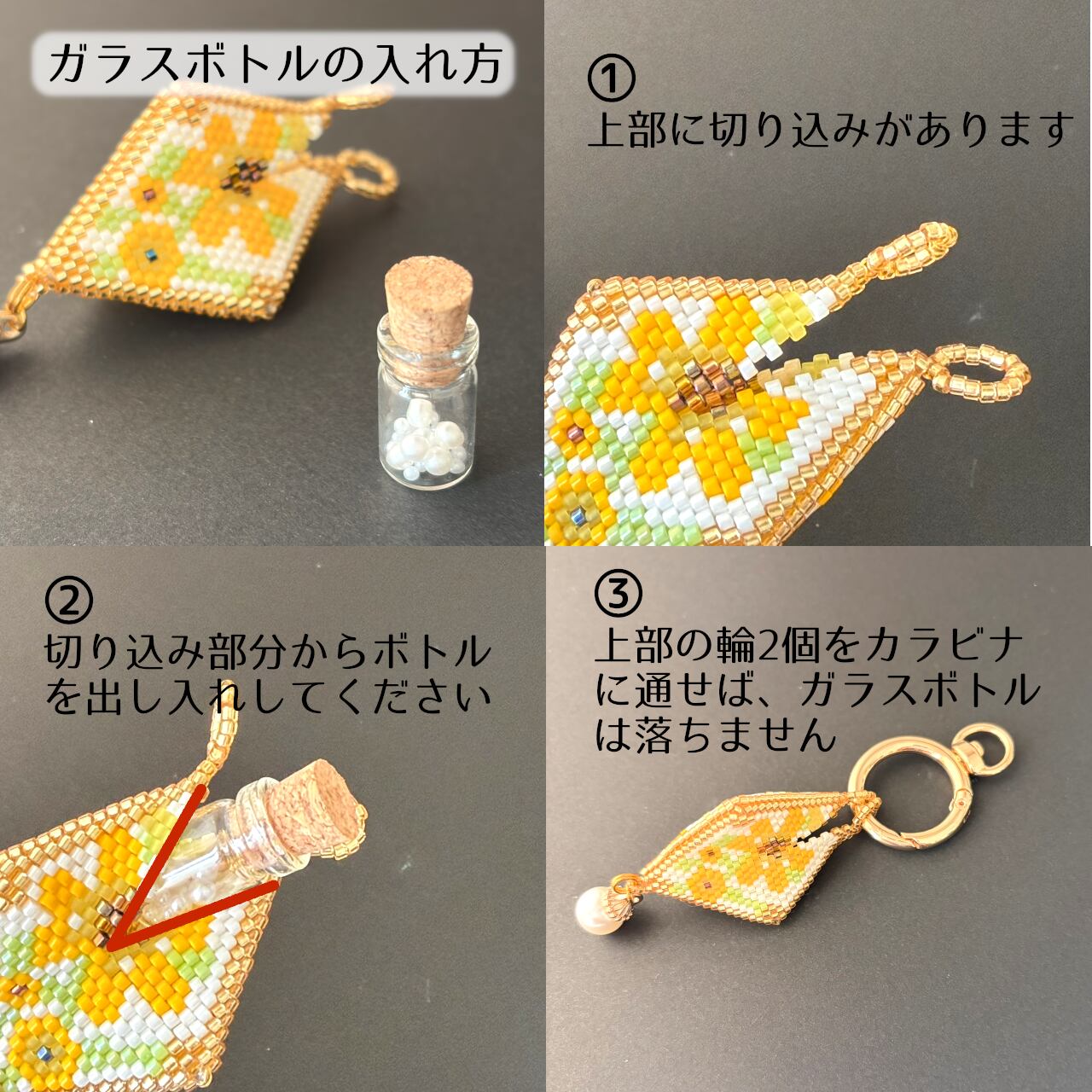 愛しい子たちの大切な一部をレジン等の薬品で閉じ込めるのは心痛く、いつでもそっと覗き込めるような形にしたいという想いから、ビーズで編んだ多角形の中に小さなガラス瓶を入れました。