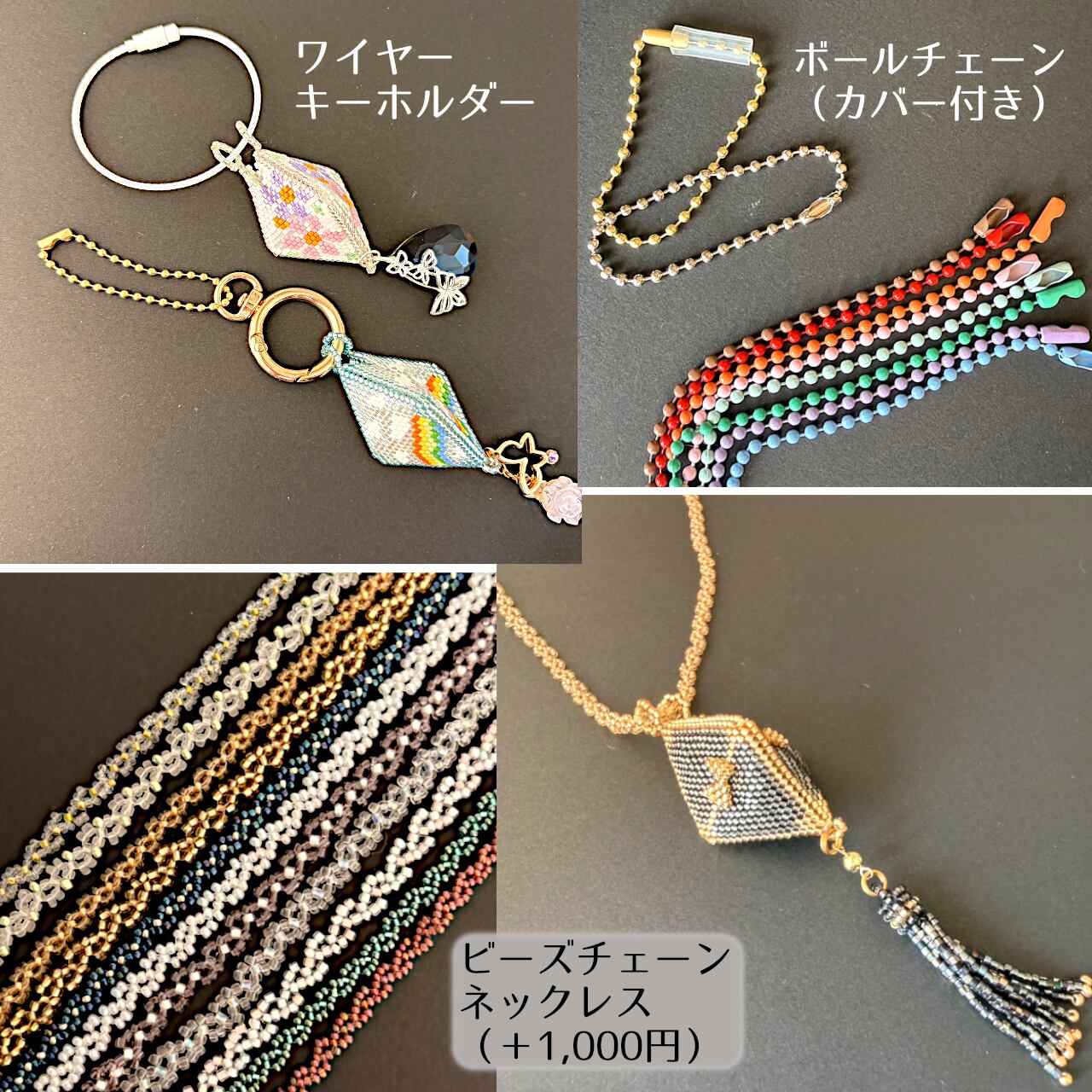 ★お持ちのネックレスに通すことでペンダントヘッドとしての使い方もできます。軽量なビーズチェーンネックレスを有料(1,000円)ですがお付けすることもできます。チャームに合わせた色合いをご提案します。